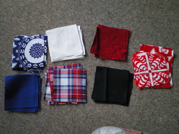 Se necesita 6 cuadrados por bloque, hizo 6 cuadras así que tuve que cortar 36 cuadrados de tela. Como tenía 6 telas diferentes fue 6 piezas de cada uno. Corté un par extra de cada uno que me diera así flexibilidad en los patrones de los bloques.