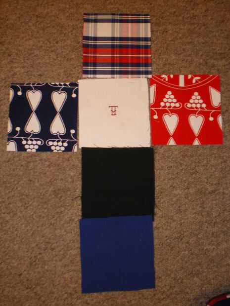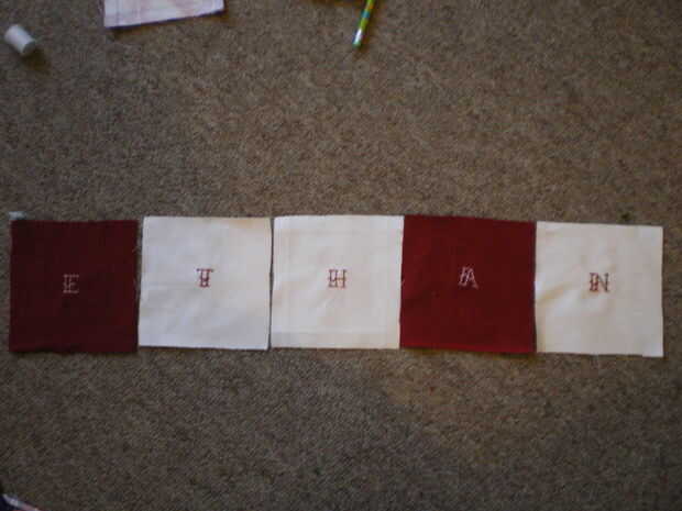 Como se puede ver bordadas cinco plazas para deletrear un nombre, puede añadir en forma de parches, letras, o similar. Uno de estos cuadrados bordados formarán parte de cada bloque.