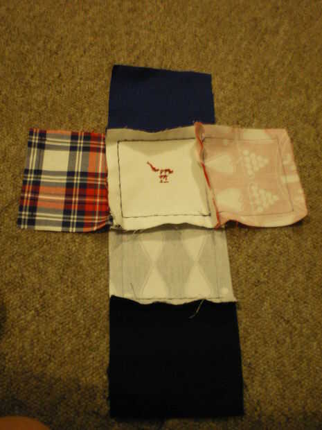 Seguir coser en las otras plazas hasta que tenga forma de Cruz. Ver la foto de referencia.
