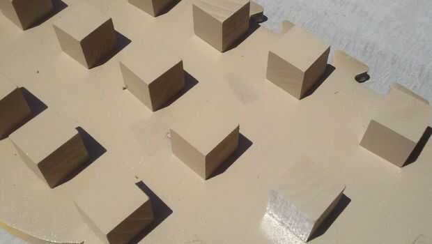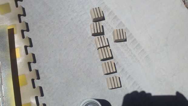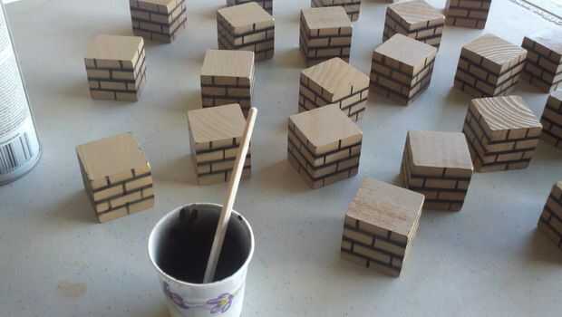 Después de que seque la pintura marrón hice una plantilla rápida que las líneas horizontales del mortero de los bloques de ladrillo. Pegué los bloques con una ráfaga rápida de pintura en aerosol negro. Me rociaron un lado, deje que se seque, dado vuelta los bloques y rocía el siguiente lado... y así sucesivamente.