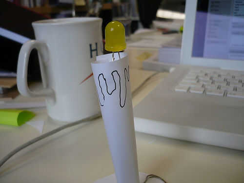 Ahora, rodar la parte de papel de la vela del LED a la forma de vela, cinta adhesiva y sacar un poco de goteo vela (muy importante para cumplir con el cliché)