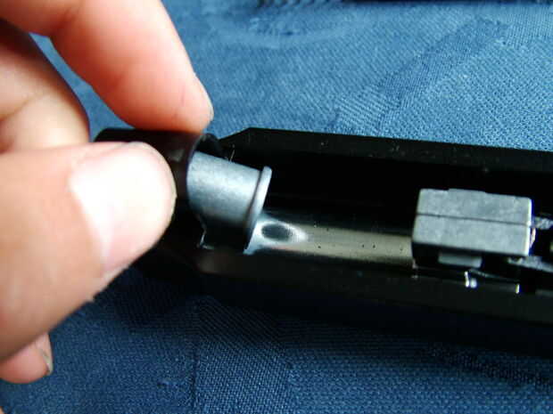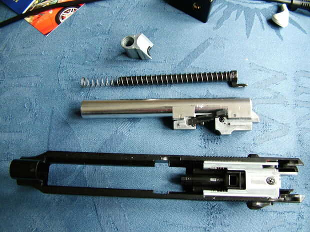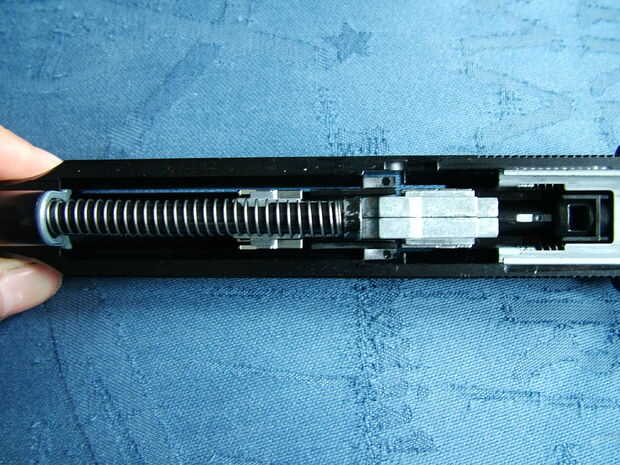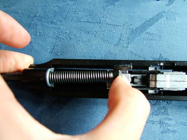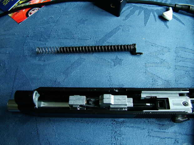 Para comenzar a remover la diapositiva, que necesita impulsar el muelle se comprime manteniendo atrás el montaje de barril, hay un pin de muelle lo manteniendo en el conjunto del barril Deslice hacia fuera y luego gire el muelle 180 grados para que el pin está en la parte inferior, tirando a continuación hacia el muelle del bloque de muelles , puede dejar el muelle en una sola pieza en este momento.