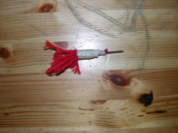 Estas son el tipo más fácil de munición para hacer. Simplemente cortar pequeñas tiras de hilo (o cortar 1 tira larga y doblar) y cinta adhesiva en la parte posterior de la uña. Asegúrese de que la cinta tiene un buen agarre en el hilo y el clavo, para que no caiga cuando disparó. Tiene que haber suficiente hilo para que bloqueará todo el aire detrás de las uñas cuando está en la pistola, pero no es suficiente para que cause exceso arrastre cuando es despedido. Sólo experimente hasta que consiga la cantidad perfecta de hilo a utilizar.