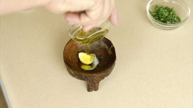 Para realizar nuestro aguacate y Basilio Mayo en nuestro mortero y maja (en realidad estoy usando y Molcajete de madera de hierro) empezamos con un diente de ajo, 1/8 cucharadita de sal y una cucharada de aceite de oliva. Luego lo del puré en una pasta.