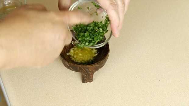 A esta pasta le añadimos fresco 1/4 taza albahaca que ha sido picado más o menos. Luego lo molemos en la pasta.
