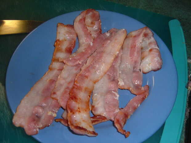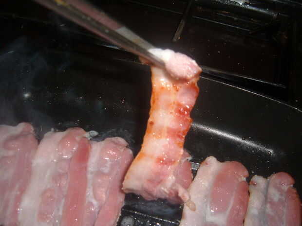Cocinar hasta crujientes por un lado, voltear y cocinar por el otro. Justo después de poner el tocino en la sartén, poner una placa de cerámica en el microondas durante 3 minutos. Una vez hecho el tocino, poner en el plato, poner de nuevo en el microondas - no nuke allí, cierre la puerta y dejarlo ahí. Ayuda el tocino mantienen calientes, y todavía hay un paso más antes de que podemos construir nuestro sándwich.