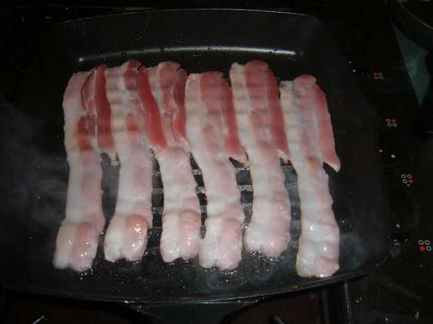 En primer lugar, coge una sartén, poner en un quemador y añadir un chorrito pequeño de aceite. Encienda el calor y dejarlo durante 2-3 minutos. Nunca debe poner comida en una bandeja fría - tiene un hábito de absorber aceite, que termina con la comida enmascara que tarda más en cocinar. Una vez que es chisporrotear el aceite, agregar el tocino. ¿No te gusta ese sonido? Sí.