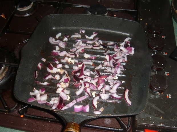 Añadir otro chorrito de aceite y dejar calor durante un minuto o tan. Una vez que es sonido otra vez, añadir la mezcla de cebolla roja y ajo. Mientras se cocinan, aplastar con un objeto plano - utilicé una trituradora de la patata, pero cualquier cosa plana trabaja. Sólo asegúrese de que obtener tanto jugo de la cebolla como sea posible.