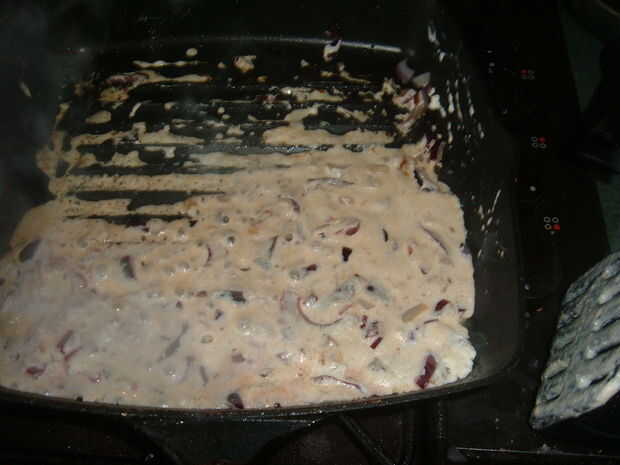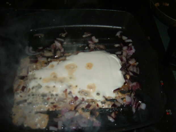 Una vez que todo es plano puré, añadir 100ml o menos de crema agria. Tan pronto como está en, mezclar y seguir mezclando hasta que quede un color crema oscuro. Cos está pasando el último paso del gancho agarrador el tocino...