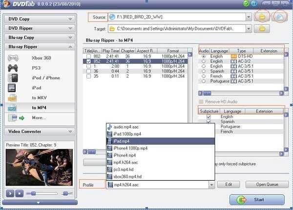 A continuación, seleccione los títulos de película que desea copiar (puedes escuchar el título resaltado antes de la conversión en la esquina inferior izquierda), comprobar la secuencia de audio/subpicture prefiere. En este ejemplo, estamos rasgando Title852. (Véase la ilustración de abajo)