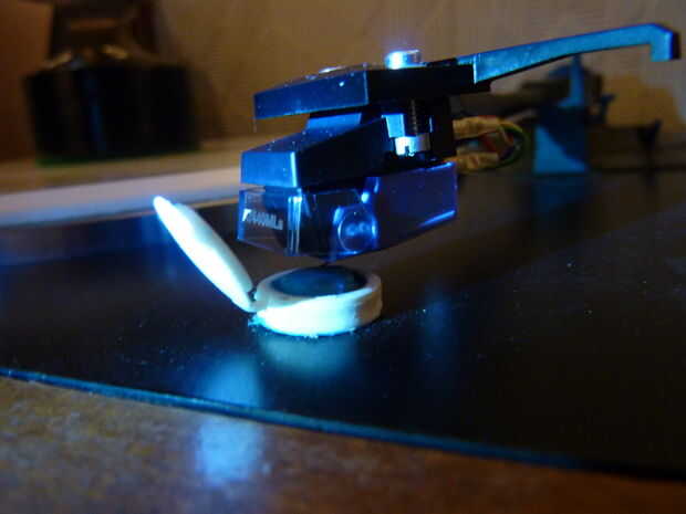 En lugar de cepillado, ahora uso un poco de masilla removible, o "blue tack" colocado en un lugar conveniente en la cubierta de mi plato. Al mover el brazo sobre hacer un álbum, yo simplemente sumergir la aguja y toque a este material pegajoso.