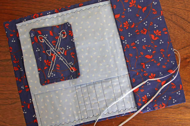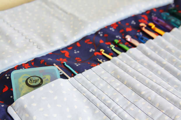 Blue Crush tiene ranuras para 15 ganchos (de grande a pequeño), un bolsillo para mantener nociones tales como contadores de puntadas o ganchos más/extra grande y un bolsillo más pequeño con bordado de encargo para sus nociones de crochet pequeños como agujas de coser. La solapa de superposición mantiene sus ganchos protegidos y las cintas blancas adjuntadas le permite garantizar el organizador cerrado.