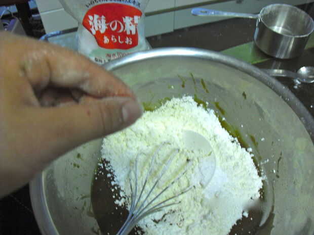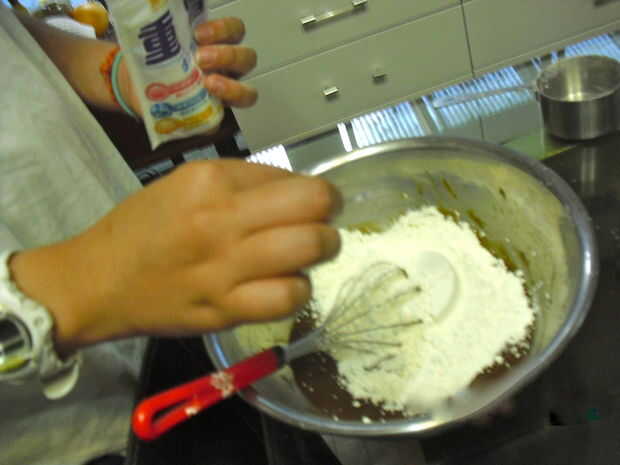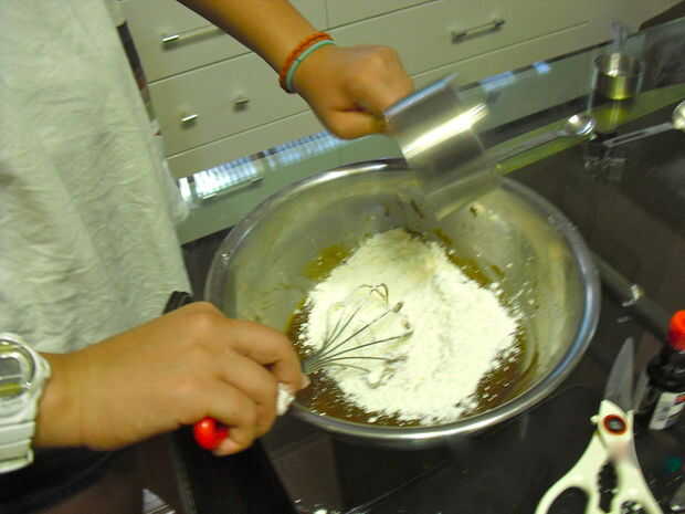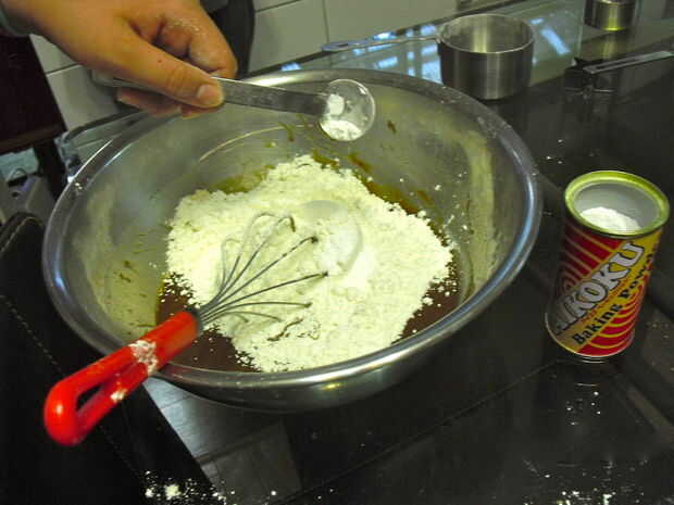 6. Agregue la harina, bicarbonato de sodio, polvo de hornear y la sal y mezclarlo todo junto.