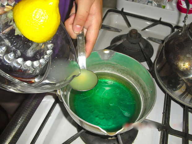 4. Añadir el zumo de manzana con la gelatina en el zumo de manzana caliente y mezclar bien.