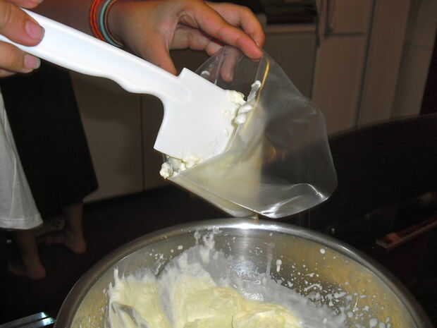 4. una vez que está montada la crema pone en una manga pastelera para decorar más tarde el parfait.