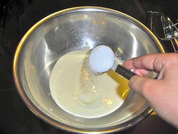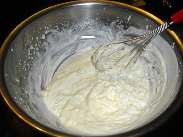 3. batir la crema hasta que se sostiene firmes picos al levantar el batidor o mezclador. Es más fácil de usar una batidora eléctrica para batirlo, pero también puede batir a mano. Asegúrese de no sobre batir la crema.