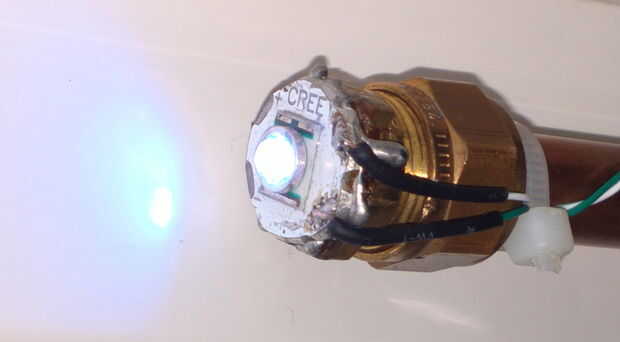 Coloque el Cree P4 en el charco de soldadura de estaño en la parte superior la tapa del extremo. Centro de la placa PCB. El PCB se enfríe y endurezca rápidamente la soldadura.