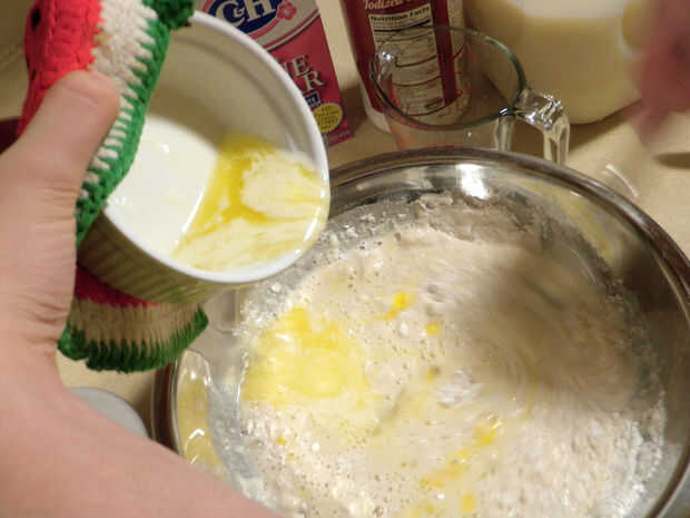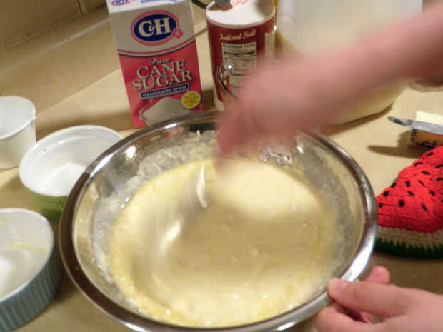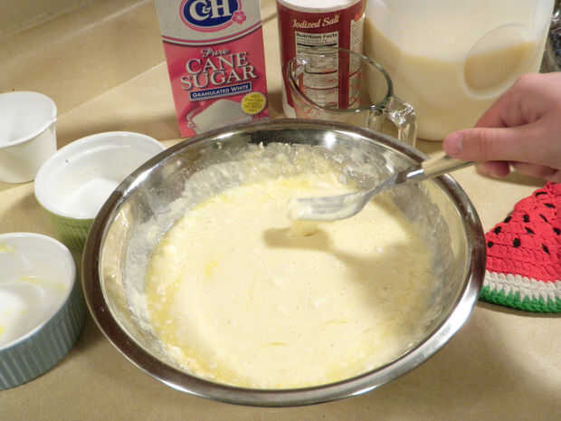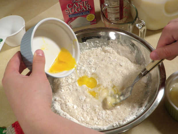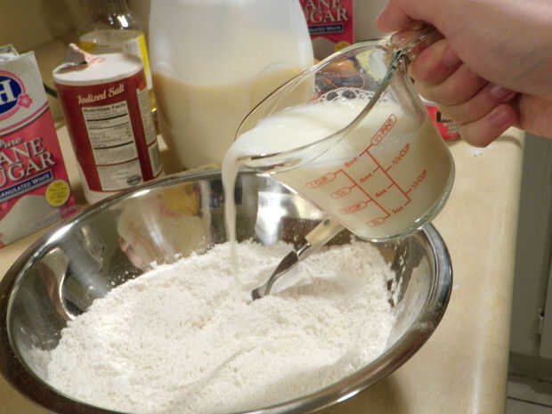 Mezcla de 2-1/2 tazas de leche en la mezcla de harina. Siga con la mantequilla derretida y dos huevos. Mezclar hasta que la harina esté completamente húmeda y la mezcla tiene un color uniforme en el recipiente. Sobre no mezclar.