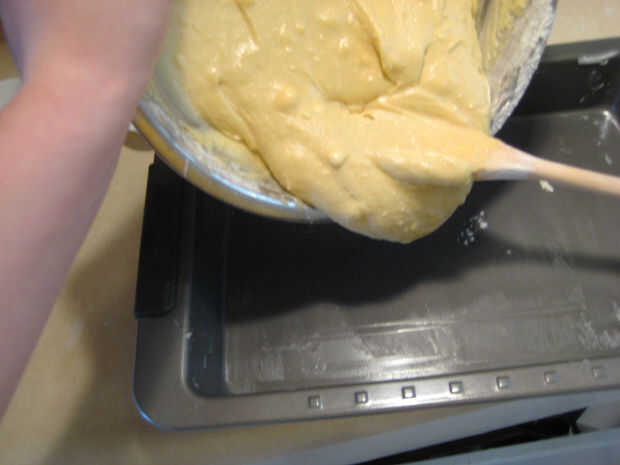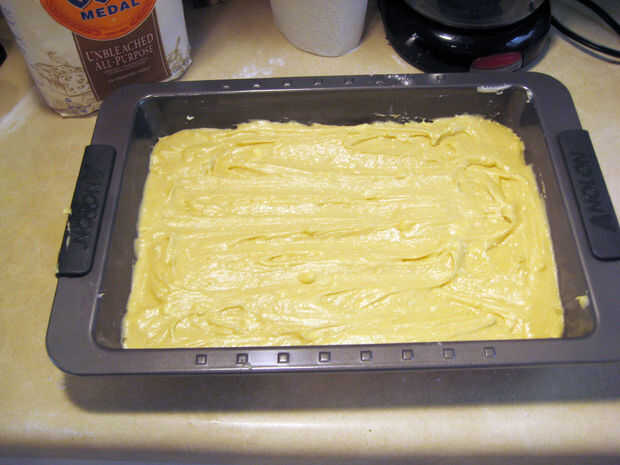 Vierta la mezcla en el molde para pasteles y extendió para que cubre la bandeja completa y es más o menos pulgadas de profundo.