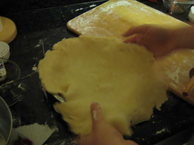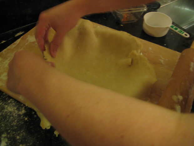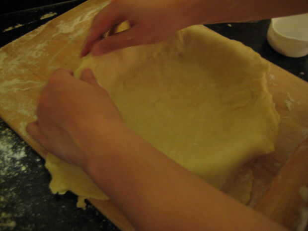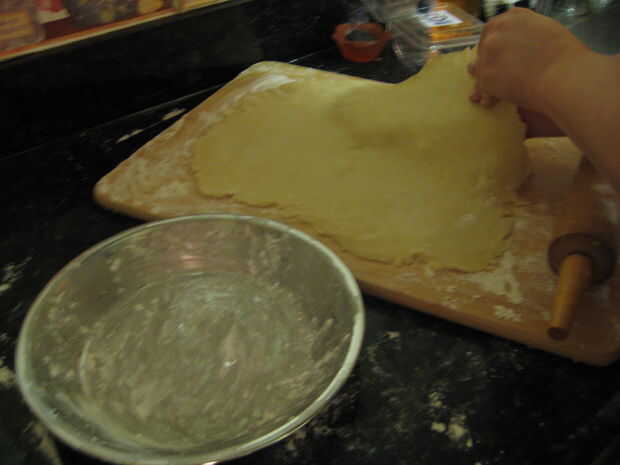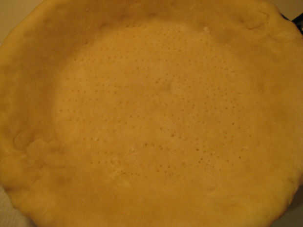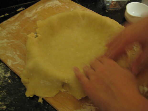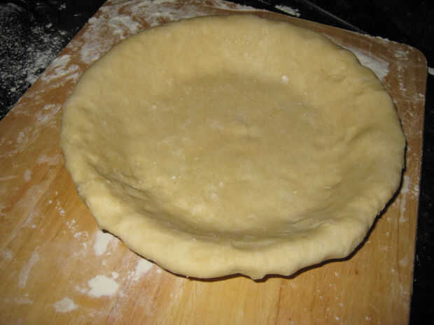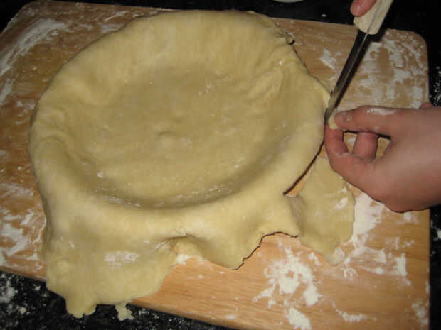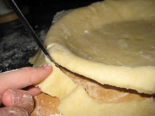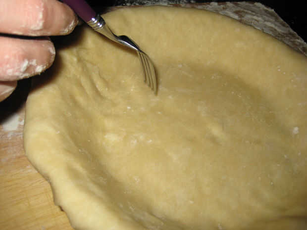 Con ambas manos, levante con cuidado la masa fuera del mostrador y transfer en la bandeja de empanada (tenga cuidado de no rasgarlo). Suavemente empújelo hacia abajo para que llena el plato de la tarta entera. También, recorte la masa adicional de alrededor del borde. Si usted quiere, usted puede punto ligeramente en la parte inferior de la tarta con el tenedor (pero no recorrer todo el camino).