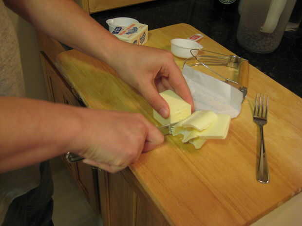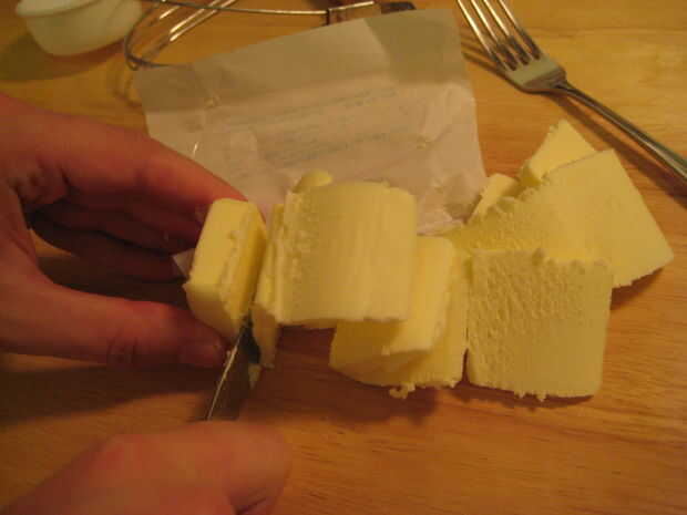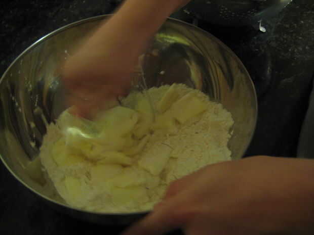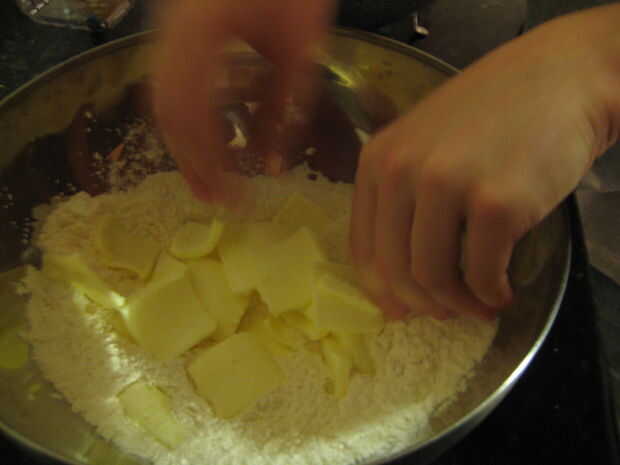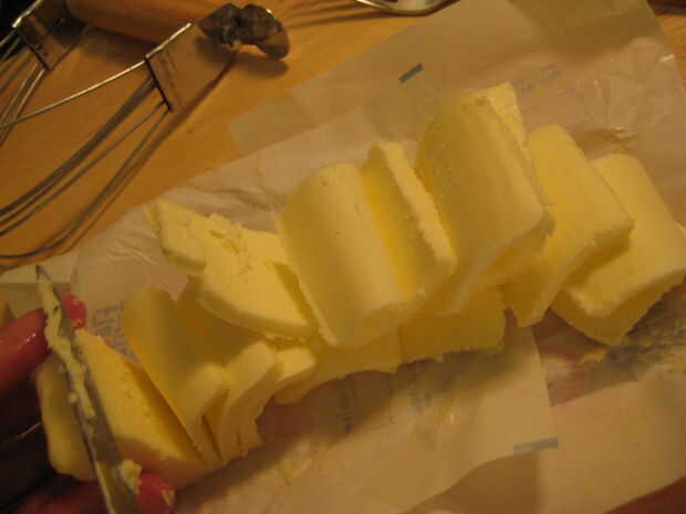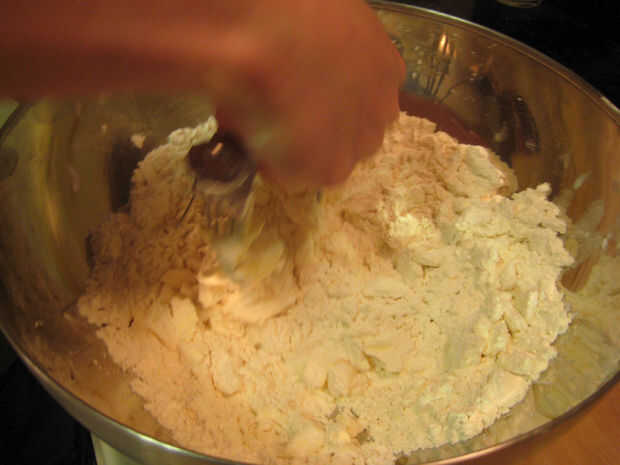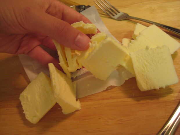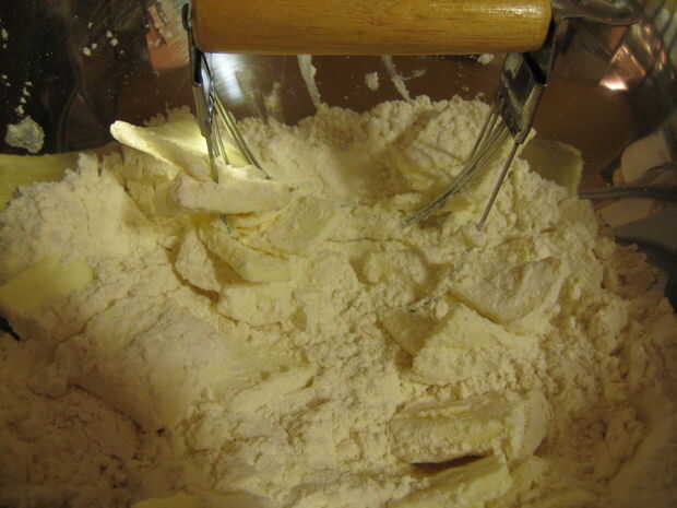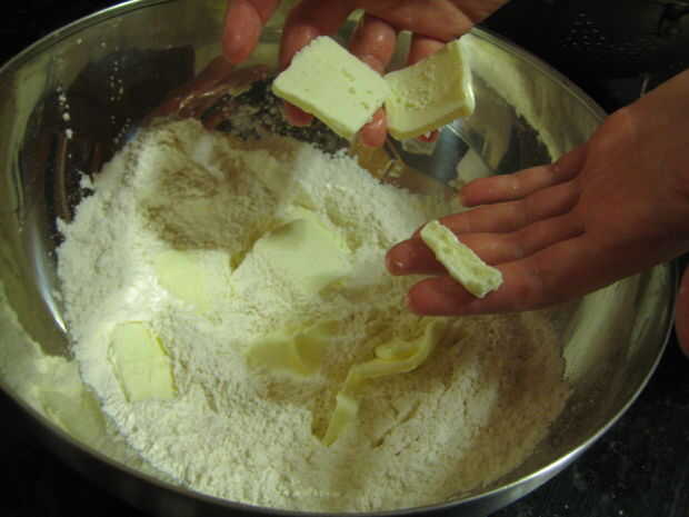 Tomar sus dos barras de mantequilla fría y cortada en rodajas pequeñas. Poner las rodajas en la masa y mezcla con tu batidora de repostería. No sea tímido acerca de él. Necesita moler todo junto hasta que comience a formar pequeños grupos.
