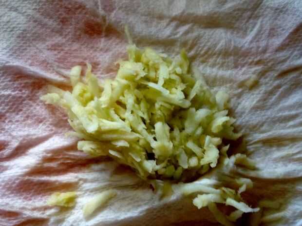Pelar y rallar la manzana Granny Smith, en toallas de papel (o un paño de cocina limpio) y sacar seco. Aprendí de se ilustra Cook que la pectina natural de la manzana es un espesante maravilloso en vez de usar tapioca todos que puede fijar el pastel demasiado.