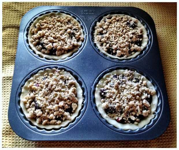 Vierta el relleno de arándano melocotón sobre la masa de empanada y top con la capa congelada se desmoronan. Traslado a calentado hornear hoja y cuece al horno hasta que el relleno es burbujeante y la parte superior es marrón, oro 45 a 55 minutos, girar la bandeja para hornear a la mitad de la cocción. (Si el relleno marrones demasiado rápidamente, cúbralos con papel).