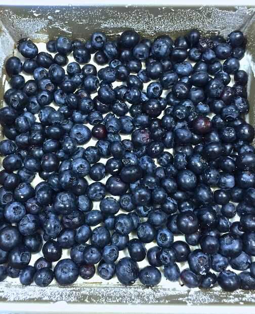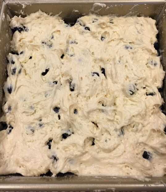 Espolvorea los arándanos enjuagados y secos uniformemente sobre la mezcla de café pastel de arándano. Cuidadosamente repartidas uniformemente la mezcla de café pastel de arándanos restantes en los arándanos.