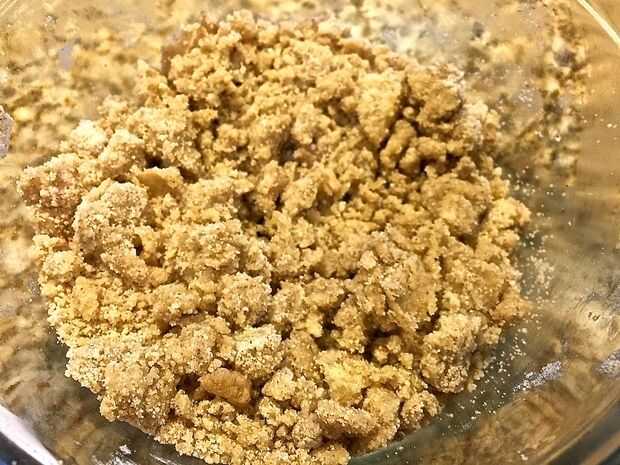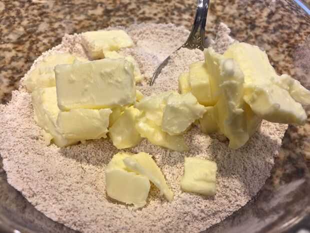 Con un tenedor o los dedos, cortar la mantequilla, similar como lo haría para galletas caseras o de tarta.