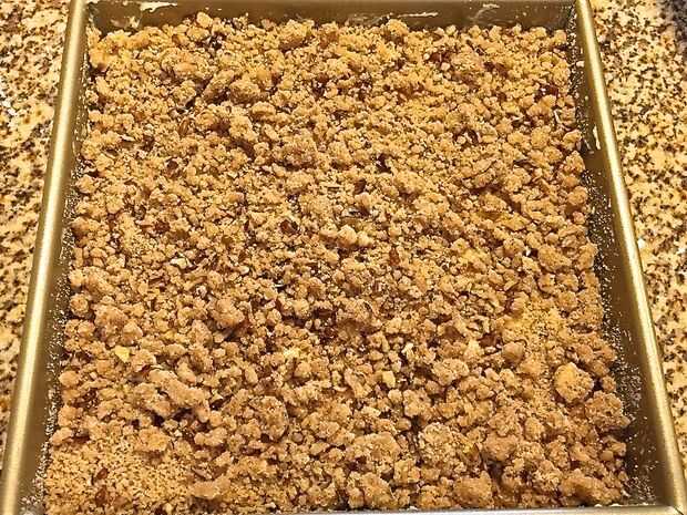Rocíe uniformemente el relleno de milhojas fría sobre la masa de pastel de arándano café.
