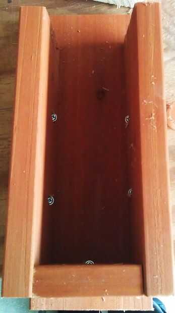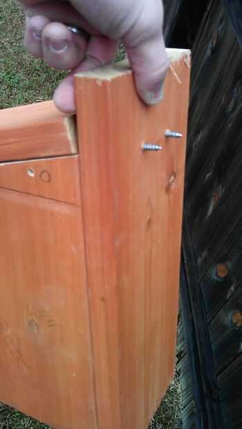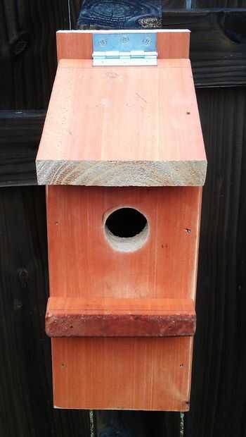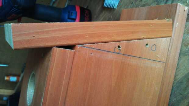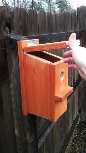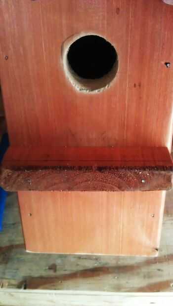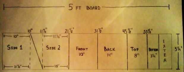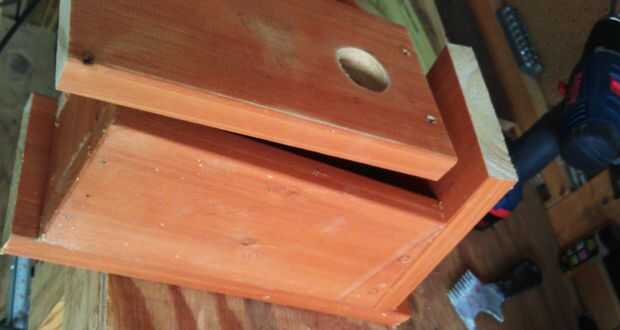 Utilice la foto proporcionada de mis medidas y marque la tabla (realmente sólo tienes que poner una cinta métrica a lo largo de la placa y marque la fila superior. así de fácil). Hacer los cortes (primer corte debe ser en un ángulo de 15 grados, el resto serán cortes rectos). Montar como se muestra (también pueden usar clavos en lugar de tornillos). No te olvides de perforar los orificios de ventilación en la parte inferior, frente y lados. Esperan para las aves.