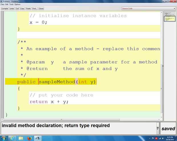 El error más común y difícil programadores es describir lo que el método para ser. El método es como la variable de instancia, puede ser público, privado, int y double. Pero (como dije en el anterior "instructivo") el método puede incluir vacío o estática. pero en este caso, utilizando uno de estos parámetros se llevan a un problema donde la única solución es eliminar la variable y, pero queremos decir que se agrega "x" a "y". El error dice "retorno tipo requiere". Tenemos el método devolver algo, pero si miramos de cerca el error dice "retorno tipo requerido". Y por "tipo" el código no significa vacío o estática. Esto significa que necesitamos contar el método que es la adición de número por escrito: "int" o "doble" hacia el error solucionado...