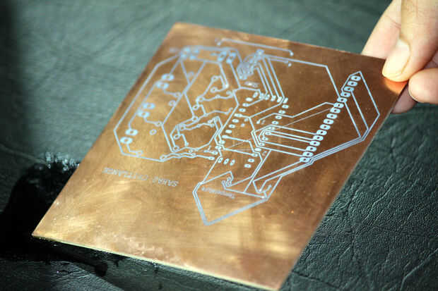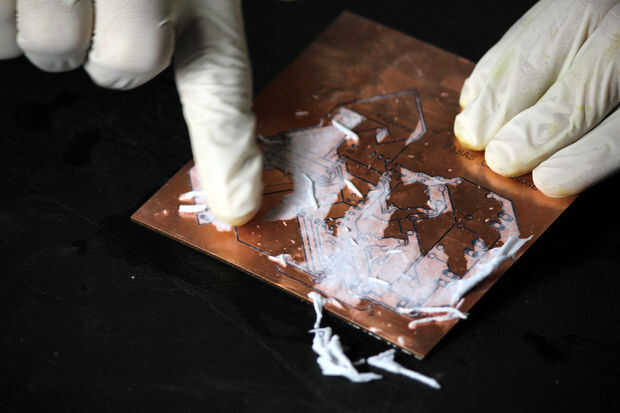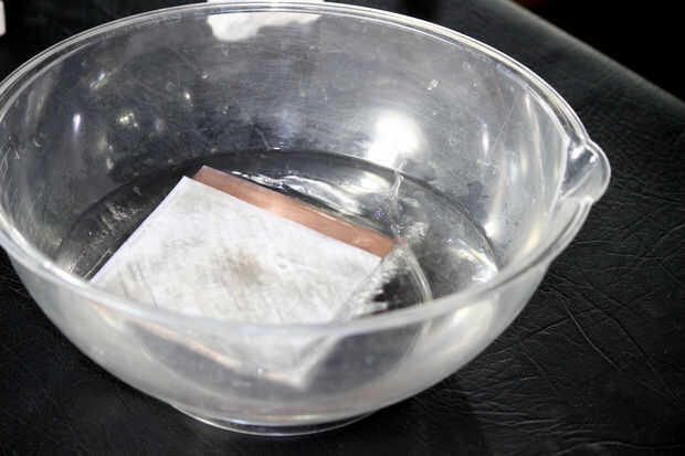 Ahora que hemos transferido el toner a la placa (¡ ojalá!), Remoje el PCB en el agua.