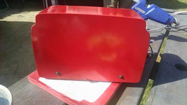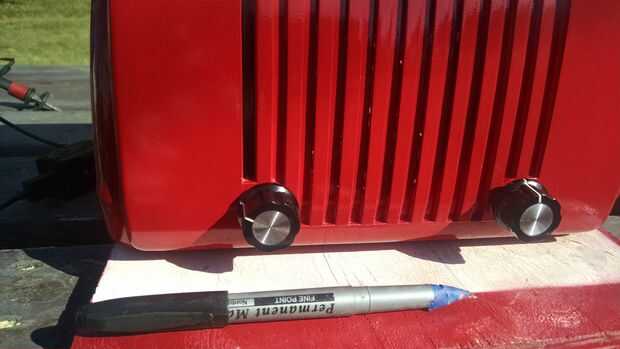 he instalado el panel posterior y pelada la cinta de enmascarar poner las partes internas dentro, poner las perillas en y solía un marcador permanente color negro para contrarrestar el aspecto de la radio y profundidad las rejillas del altavoz. también me alegro que mantuve la pegatina original para mantener el look vintage