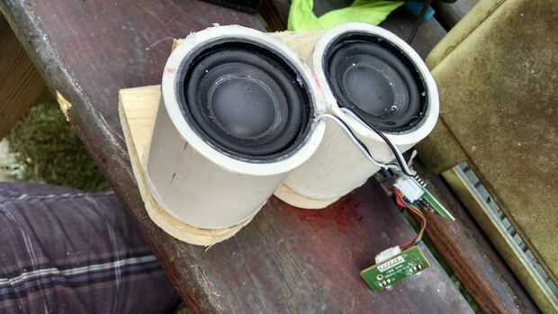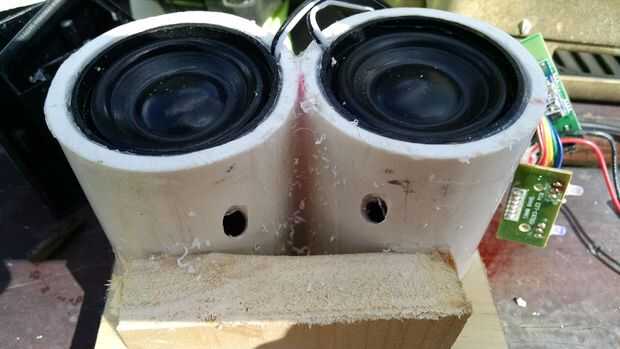 corté una bace de pino de 3/4 y silicio utilizada para pegar los tubos en lugar entonces pegado otra pieza bajo los tubos de apoyo entonces probado el sonido hacia fuera otra vez fue mejor pero no cómo utilizar que perforó un agujero en los tubos y les hacia el frente en ángulo y probado otra vez y viola suena igual de fábrica