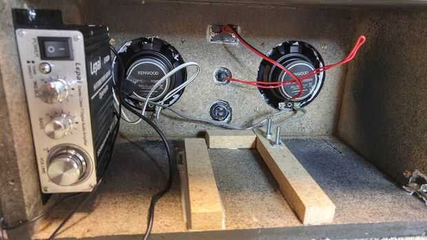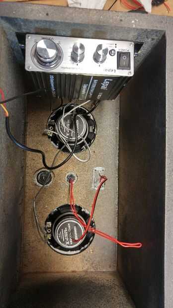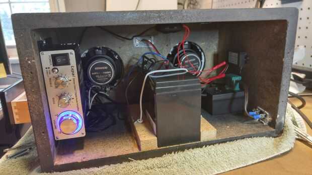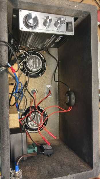 A excepción del cargador de batería, todos los componentes eléctricos están conectados a los tornillos. Lo positivo de la batería pasa por el interruptor para alimentar el perno positivo. El cargador está conectado directamente a la batería por lo que puede ser cargada cuando el altavoz está apagado.