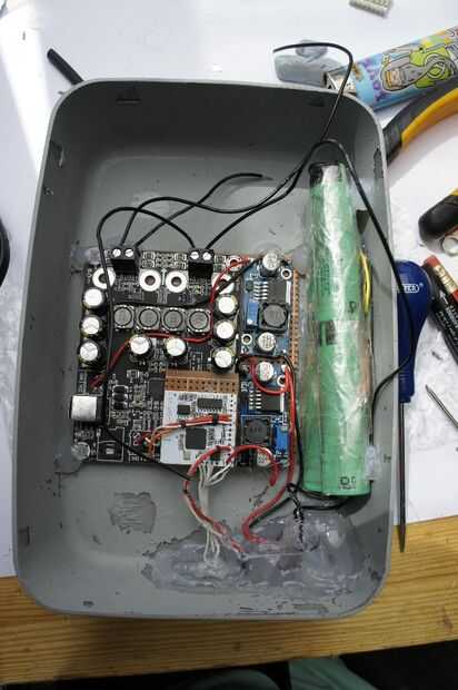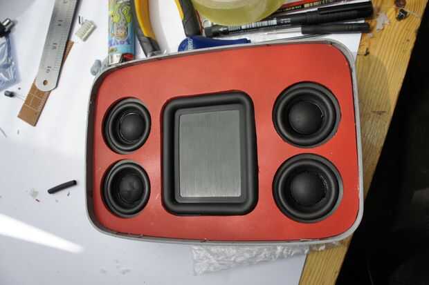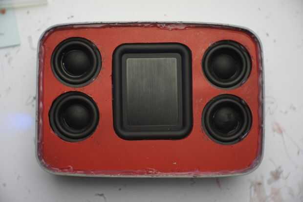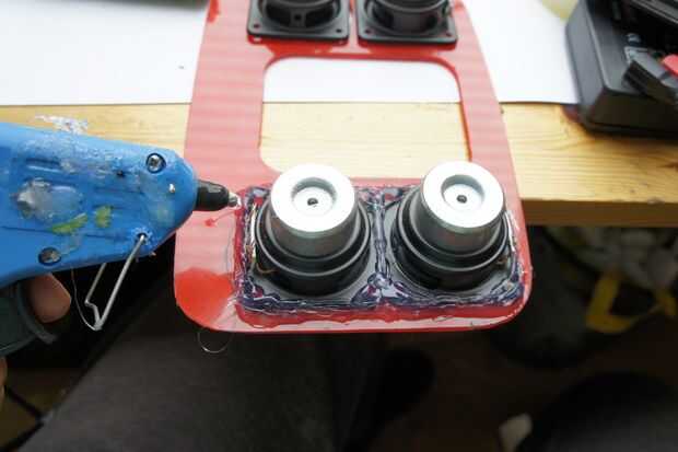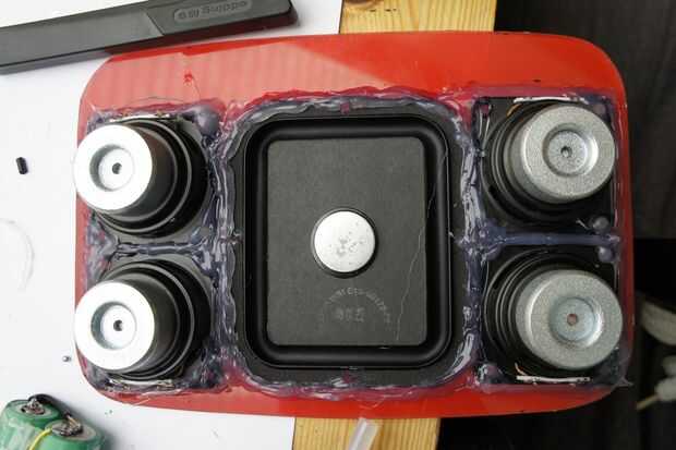 Montaje de los altavoces y radiadores pasivos, usé 2 pieza epóxido, seguido de pegamento caliente para asegurarse de que es 100% sellado. Como probablemente has notado, hay 4 drivers pero solo 2 canales, eso es porque cada canal tiene 2 conductores en serie. Cada conductor es de 4 Ohms, lo que significa que cada canal es de 8 ohms.