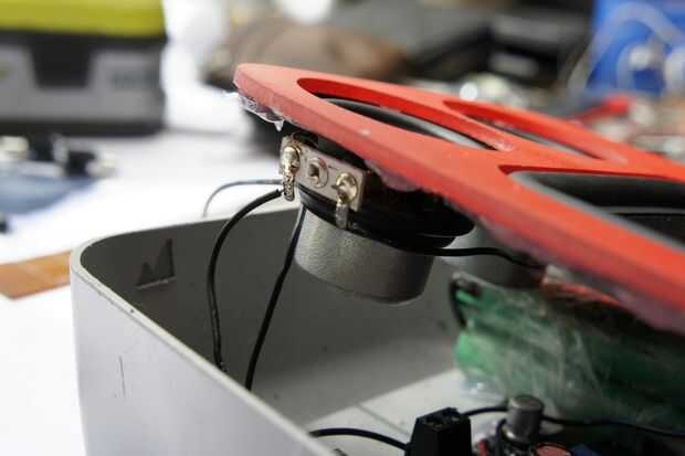 Cuando todo está todo pegado en el lugar, Solde los cables de los altavoces y el amplificador, la ranura del panel frontal en el gabinete. Prueba el altavoz en el tiempo final antes de pegar en la parte delantera. Para pegar en la parte delantera, ejecute una línea de pegamento caliente en el espacio creado entre el panel frontal y el resto del recinto. Asegúrese de que el pegamento no llega por encima de 1,5 mm de la parte superior del recinto, como necesitamos que el espacio claro para el montaje de la tela/la rejilla del altavoz.