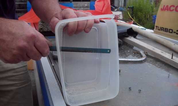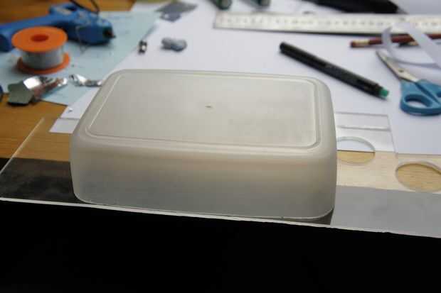 En esta versión vamos a reutilizar una lonchera vieja u otro recipiente. Es importante medir las dimensiones de las piezas y asegurarse de que va todo cómodamente encajan en su contenedor. También es importante utilizar un material de espesor suficiente para que el recinto no flexión de la presión de aire de los altavoces. Si usas plástico, recomiendo que utilizar plástico 2,5 mm de espesor mínimo. Es bueno elegir una caja que se ajuste cómodamente en la mano y también será capaz de enfrentarse de forma independiente.