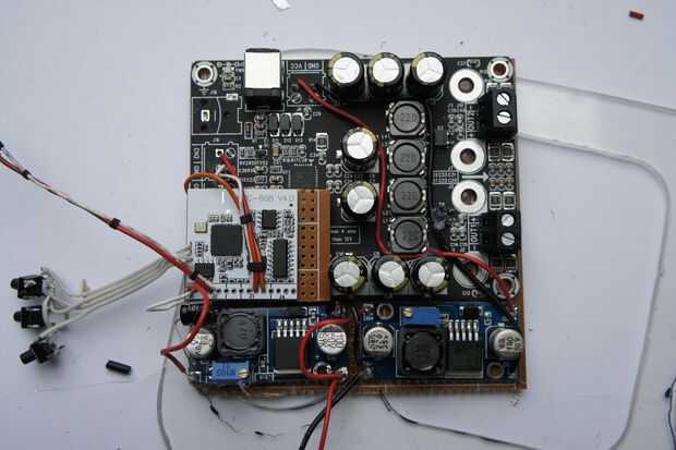 Ahora que ya tenemos los convertidores ordenados, se conectan a los cables y montarlos sobre un trozo de tablero, junto con el amplificador y módulo Bluetooth. Esto mantiene todo muy bien juntos y agrega un poco de rigidez estructural.