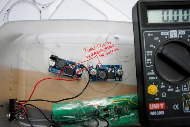 Ahora que nuestra batería está todo conectado y protegido, es hora de añadir nuestros convertidores de voltaje. Necesitamos un voltaje más alto para el amplificador y una tensión más baja para el módulo de Bluetooth. Para el amplificador, vamos a utilizar un paso de impulso hacia arriba de módulo y el módulo Bluetooth se utilizarán un buck paso por módulo. Asegúrese de ajustar los voltajes antes de conectar el módulo amp/bluetooth! Conecte las entradas y luego use un destornillador pequeño para ajustar el tornillo de metal para cambiar a voltaje (ver foto superior para fijación de tornillos ^). Usted puede monitorear el voltaje con un multímetro. Para el módulo Bluetooth 5v es ideal, y para la amp 18v es ideal.