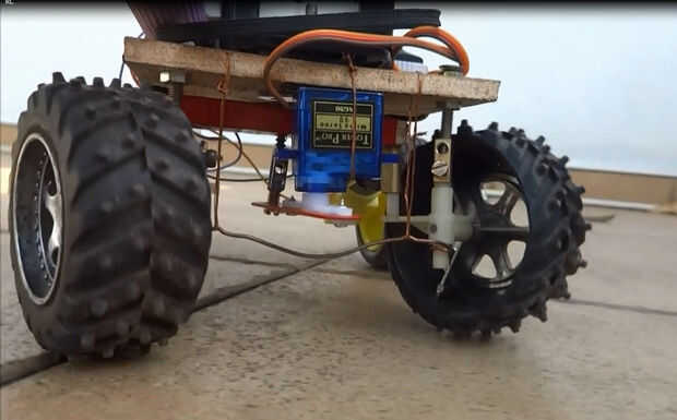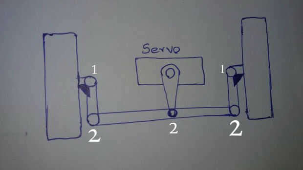 Siguiente las ruedas delanteras... Poco duro y debe ser sólida. Mira el dibujo y tener una idea acerca de cómo funciona. Estas dos ruedas están fijadas al chasis de los puntos donde no he puesto 1 en el bosquejo. La rueda gira sobre esta articulación. Así esto debe ser una suave articulación de baja fricción. Luego tienes que conjunta las dos ruedas delanteras con una barra y debe ser poco detrás del eje central de las ruedas. Luego conecte el motor servo para que la barra como en el dibujo. Asegúrese de mantener el eje del servo y el eje de las ruedas en una misma línea. De lo contrario esta costumbre ser trabajo suavemente. Las articulaciones donde he puesto número 2 en el bosquejo son también articulaciones suaves. Asegúrese de que el servo no va en relación con el chasis a un empuje pequeño. Darle una pequeña energía de pulgar y ver si su movimiento o sacudida. ¡¡¡Vale!!! la parte más difícil se hace..!!!