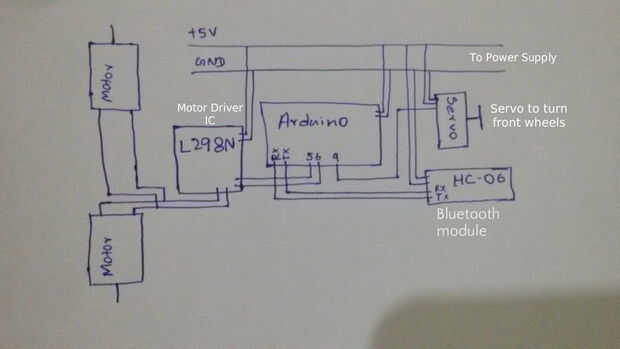 Usando un protoboard es la manera más fácil para este proyecto. Primero encienda los carriles de la energía de tu protoboard con la fuente de alimentación. Luego conecte el módulo de Bluetooth a la placa como en la imagen. Conecte la alimentación y pines GND en el riel de alimentación. Todos los pernos están marcados hay en el módulo de HC-06. Conecte el Bluetooth RX al TX del arduino y Bluetooth TX al RX del arduino.