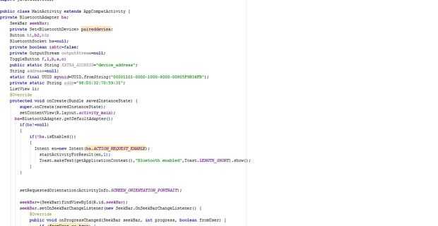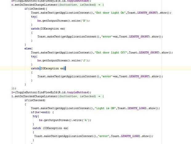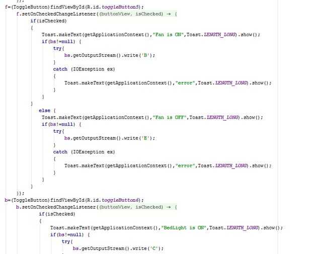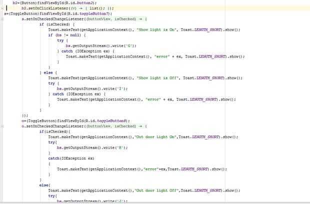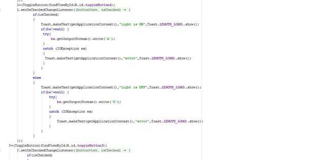 En mi proyecto diy parte crucial es la aplicación android que se puede encender un dispositivo mediante bluetooth y para las apps están disponibles pero quiero probar que puedo aprender programación android. En esta programación botones palanca usada por menos espacio en aplicación lo sobre y apagado pueden hacerse