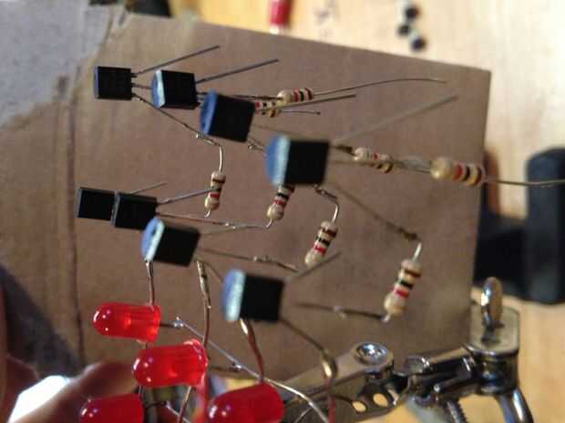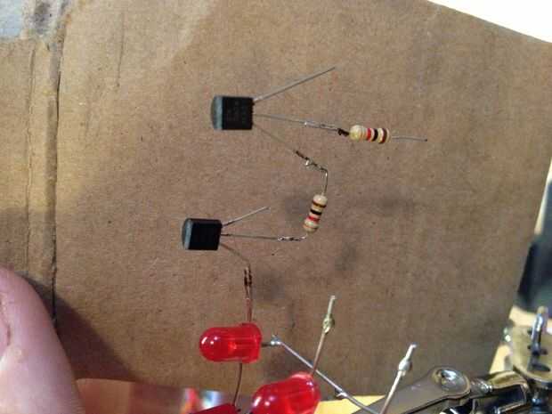 Y además agregar un transistor NPN, de su emisor a la resistencia de 1 k de soldadura y soldar otra resistencia (1K) a la base así.