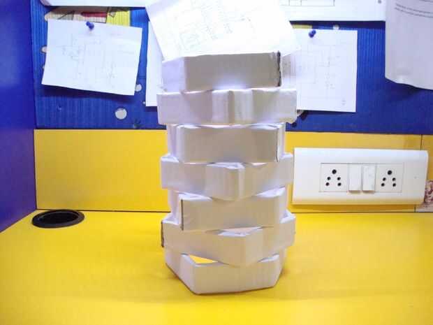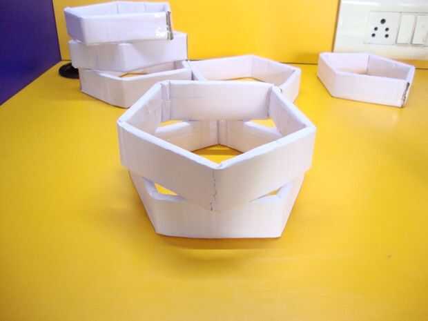 Se pegan todos los pentágonos uno sobre el otro. Asegúrese de que el borde de un Pentágono debe estar en la parte media del lado de otro Pentágono. Lo mismo para todas las demás y péguelos alternativamente. Se refieren a la imagen de arriba para obtener instrucciones.