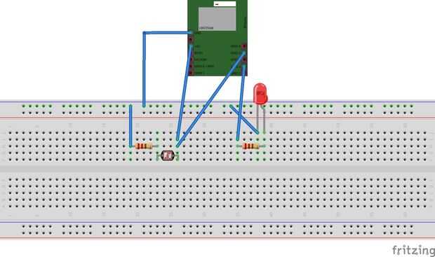 El LDR es poner en serie con la resistencia de ohmio 10 k y conectada a la tierra. La tensión de entrada proviene de los 3.3V pin y el pin GPIO 5 está conectado entre el LDR y el resistor.