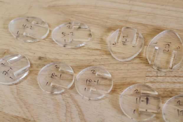 Antes de tomar las piezas de la herramienta de corte, utilice un rotulador y el PDF impreso para identificar las piezas y etiquetarlos con los números en las cubiertas de plástico. Después de etiquetar, sacar todas las piezas cuidadosamente, acrílico puede ser frágil y de la viruta.