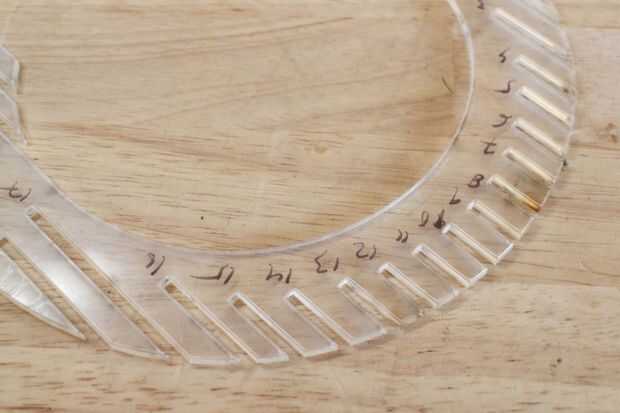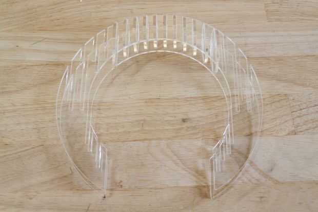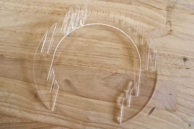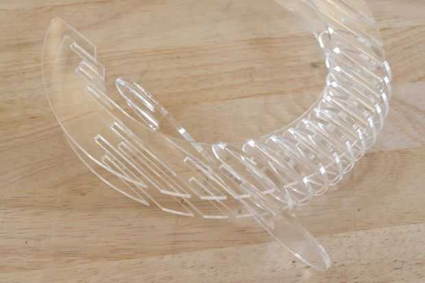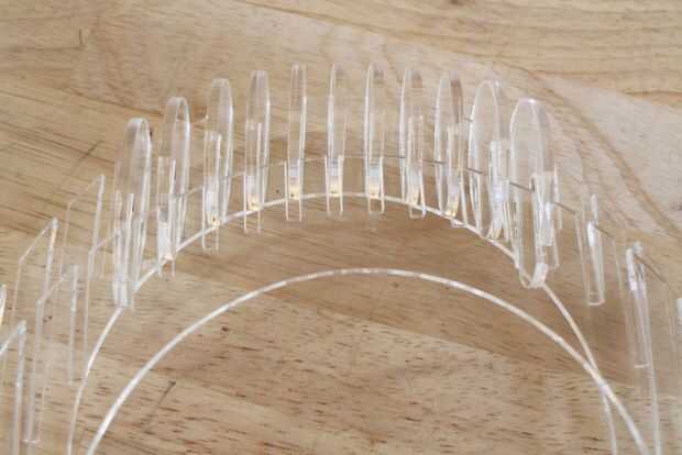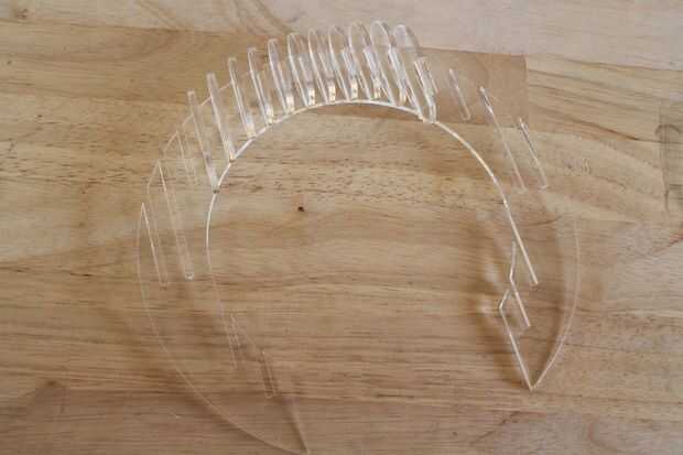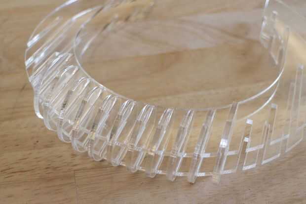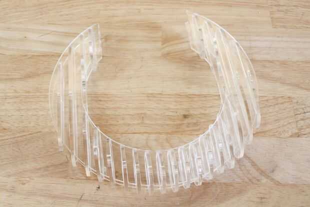 El collar está compuesto por dos piezas curvas que tienen dientes, como un peine. Los pedazos más pequeños de acrílico tienen dos aberturas que se deslizan en las aberturas entre los dientes en cada pieza. Las dos piezas se colocan paralelas entre sí, pero a partir de uno hará Juntándolo más fácil al final.