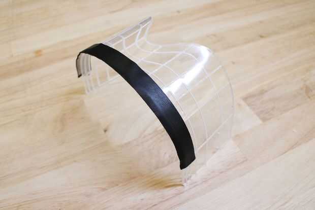 Programar el horno a 300 º F y colocar algunas láminas en una bandeja para hornear galletas. Cuando precalentado, colocar la pieza de visera en, grabado lado hacia arriba. Calor durante 7 minutos.